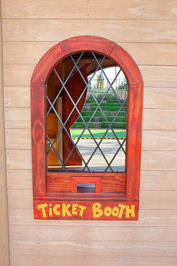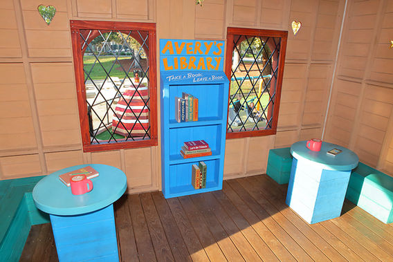 The playhouse colors were chosen by the community to honor the Spanish Missions historic to the area. Of the three Retreat Hut's installed at the playground, two are in our original blue pallete and the one closest to the playhouse is stained in similar colors to match the warm brown tones of the playhouse.