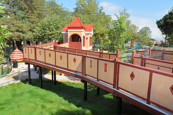 Located in Santa Clara at Central Park, this Magical Bridge Playground brings together community activities and inclusive design. Barbara's 2-story playhouse sits at the heart of the playground, providing a space for music and theater on the largest Magical Bridge theater stage we have built yet. Behind the stage are play areas for kids to let their imagination soar. Abigail's Angel Bakery features hand painted cakes and cash register, ready for aspiring bakers. Over at the Architect's workbench, tools of the trade are represented that will spark young designers and architects.